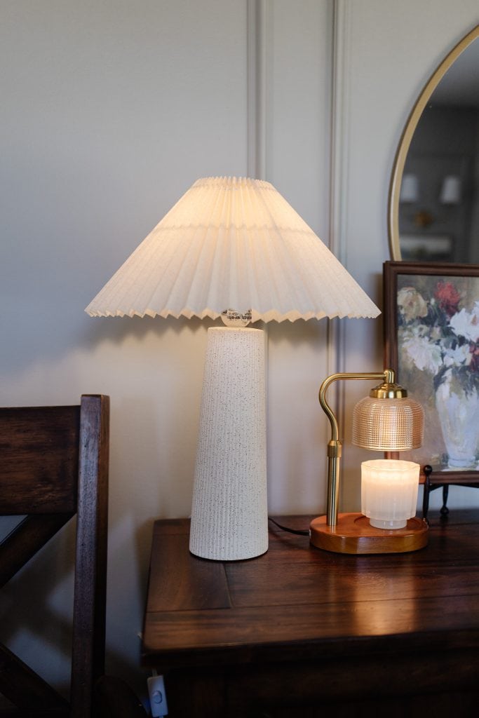 Many years ago I purchased a table lamp from Amazon (that is no longer available) but I ended up switching out it’s shade with this one.